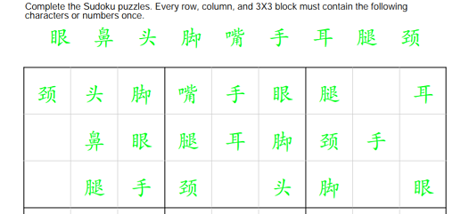 Use Chinese Sudoku Puzzle Creator tool to generate Chinese number or character Sudoku puzzles.