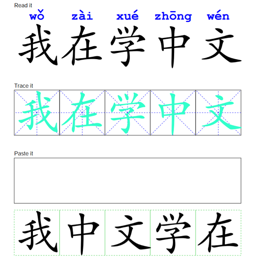 Use Read it, Trace it, and Paste it worksheet maker to create great worksheets for young Chinese learners to learn common Chinese characters and Chinese sentence structure.