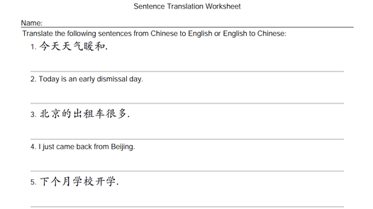 Quickly generate English-to-Chinese or Chinese-to-English translation worksheets for advanced Chinese language learners using our Sentence Translation Worksheet Maker